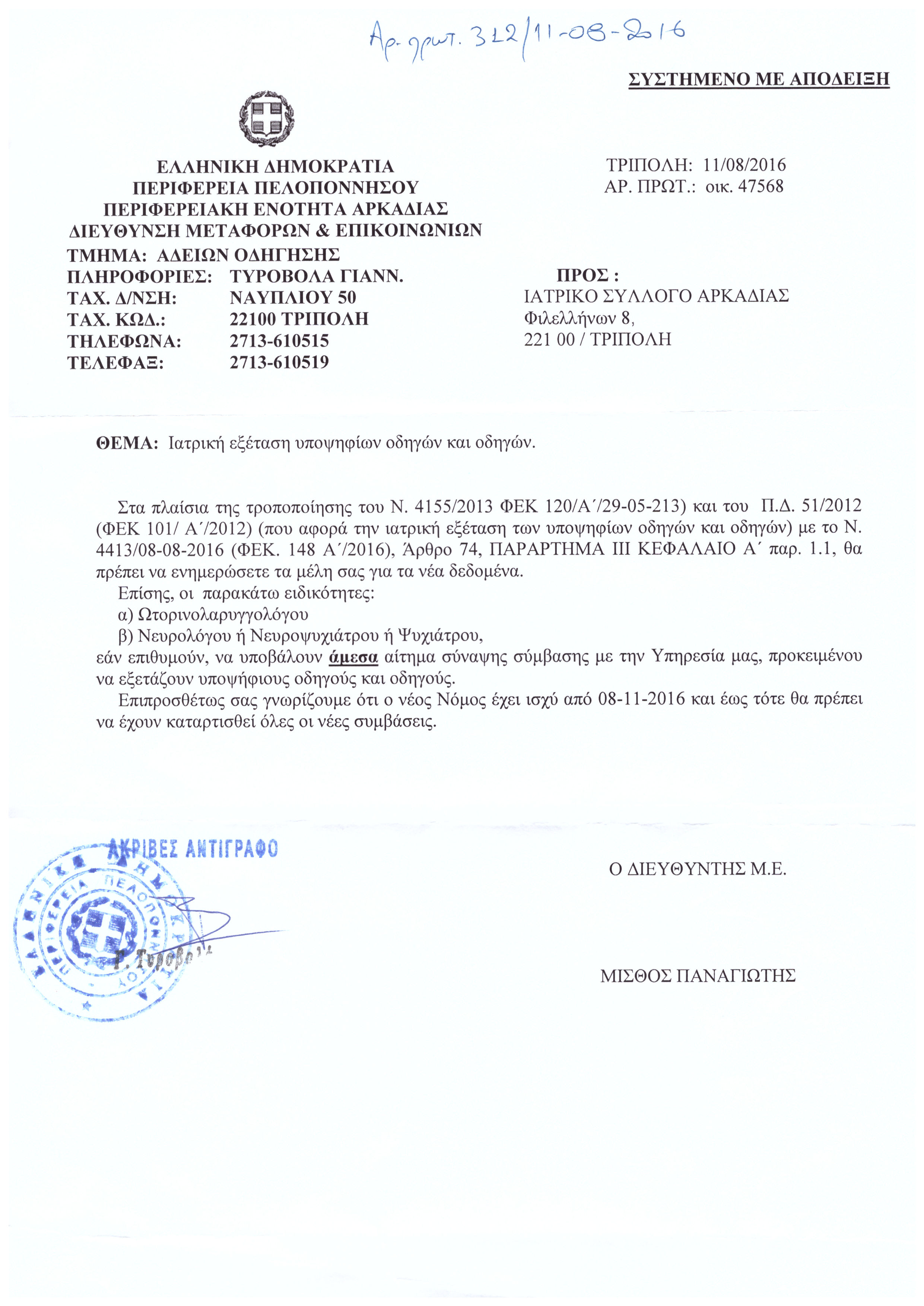 ΣΥΜΒΑΣΗ για ΕΞΕΤΑΣΗ ΥΠΟΨΗΦΙΩΝ ΟΔΗΓΩΝ 13 Αυγούστου 201613 Αυγούστου 2016 isarkadias Ανακοινώσεις/Εγκύκλιοι, Ιατρικά Αρκαδικά Νέα ΓΙΑ ΕΝΗΜΕΡΩΣΗ ΤΩΝ ΜΕΛΩΝ ΜΑΣ