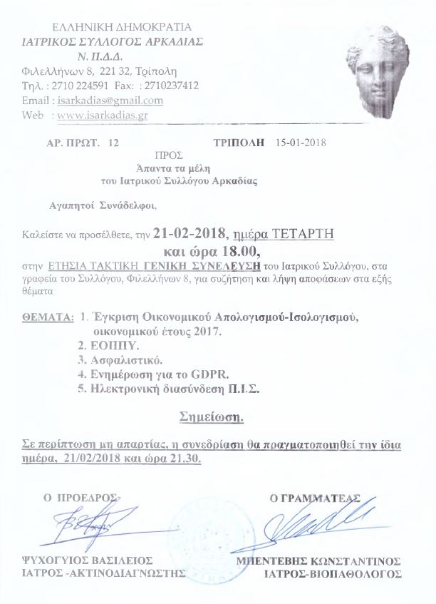 ΠΡΟΣΚΛΗΣΗ ΣΕ ΓΕΝΙΚΗ ΣΥΝΕΛΕΥΣΗ του ΙΣ ΑΡΚΑΔΙΑΣ 23 Ιανουαρίου 201823 Ιανουαρίου 2018 isarkadias Ανακοινώσεις/Εγκύκλιοι, ΔΣ Συλλόγου, Νέα Συλλόγου