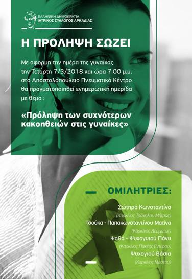 ΗΜΕΡΙΔΑ ΓΙΑ ΤΗΝ ΠΡΟΛΗΨΗ ΤΟΥ ΚΑΡΚΙΝΟΥ από τον ΙΣ Αρκαδίας 25 Φεβρουαρίου 201825 Απριλίου 2018 isarkadias Δίχως κατηγορία Με την ευκαιρία της Παγκόσμιας Ημέρας της Γυναίκας, ο ΙΣ ΑΡΚΑΔΙΑΣ, διοργανώνει ημερίδα για το κοινό με θέμα την ΠΡΟΛΗΨΗ ΤΟΥ ΚΑΡΚΙΝΟΥ, την Τετάρτη 7-3-2018, 19:00 στο Αποστολοπούλειο Πνευματικό Κέντρο. Δείτε την συνημμένη πρόσκληση.