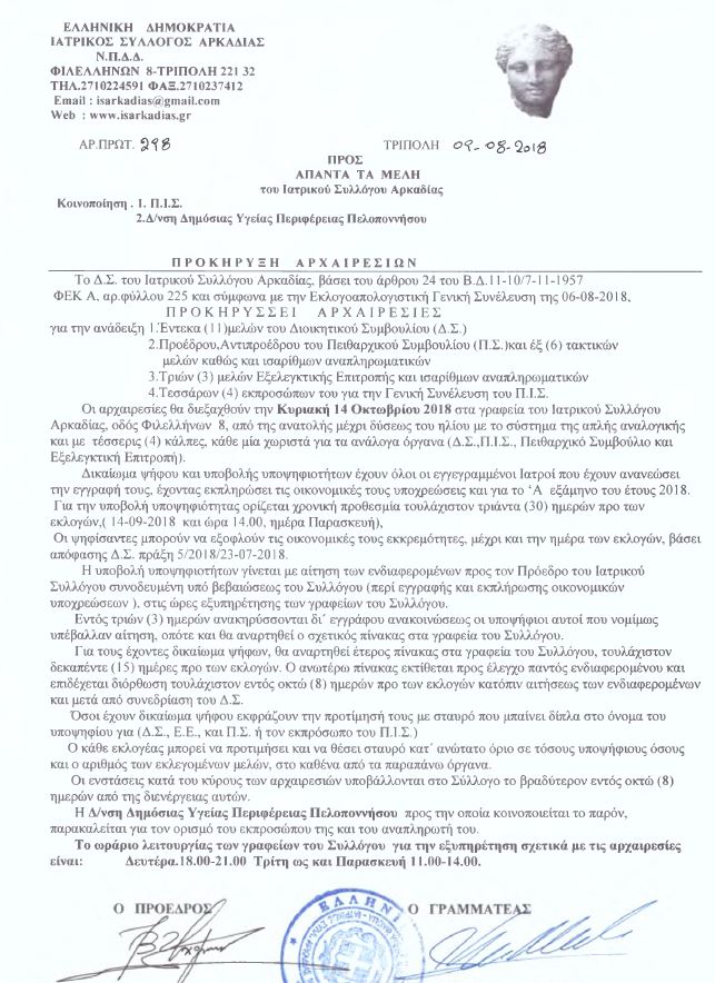 Προς τα μέλη του Ιατρικού Συλλόγου ΑΡΚΑΔΙΑΣ